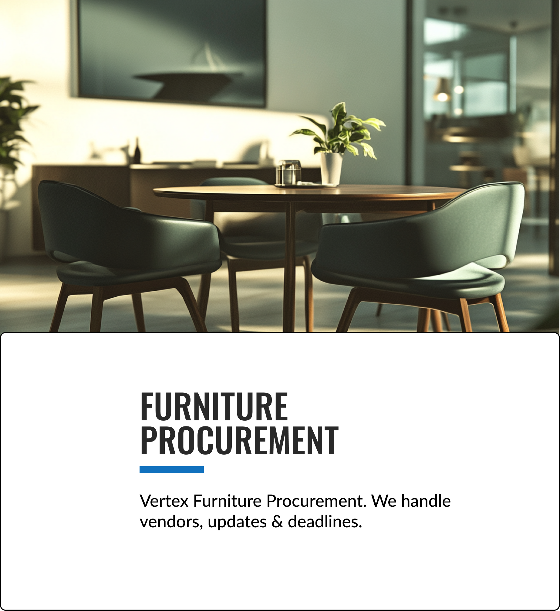 Product is good, we are very happy with the quality. There was good communication from the Vertex team during the procurement process & overall FF&E