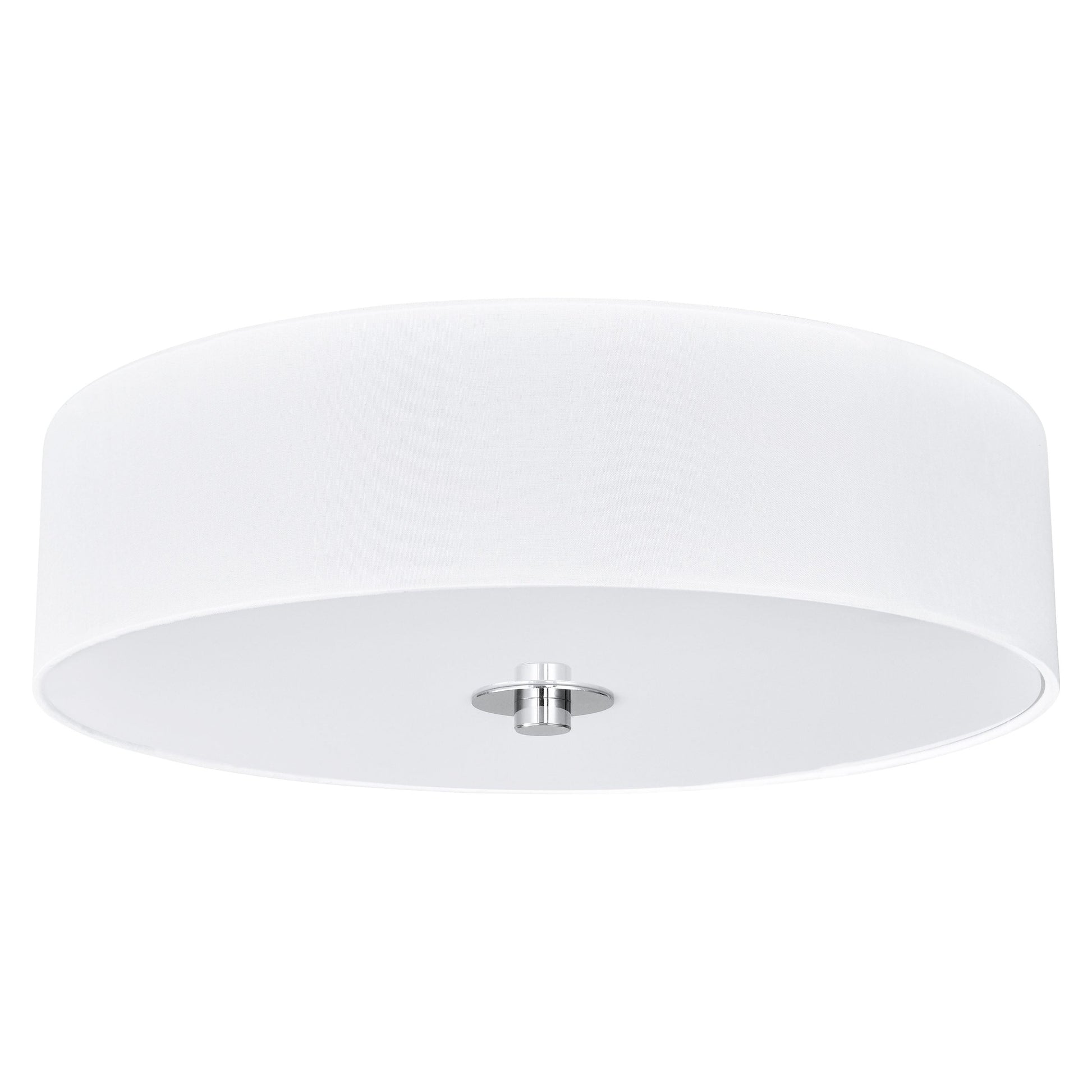 14″W Ceiling light with chrome finish, white linen drum shade and frosted diffuser