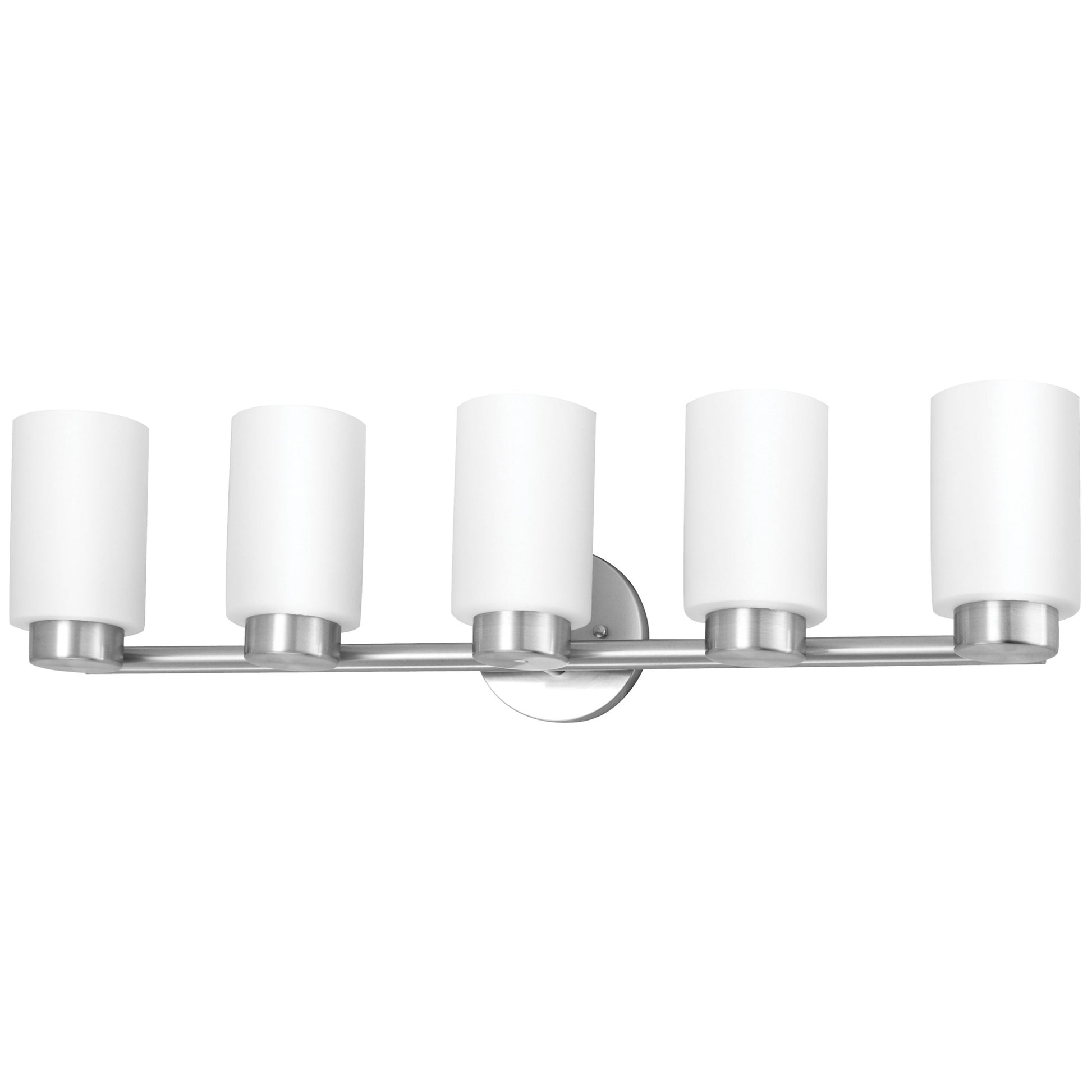 31″W Five light vanity fixture with brushed nickel finish and opal glass shades