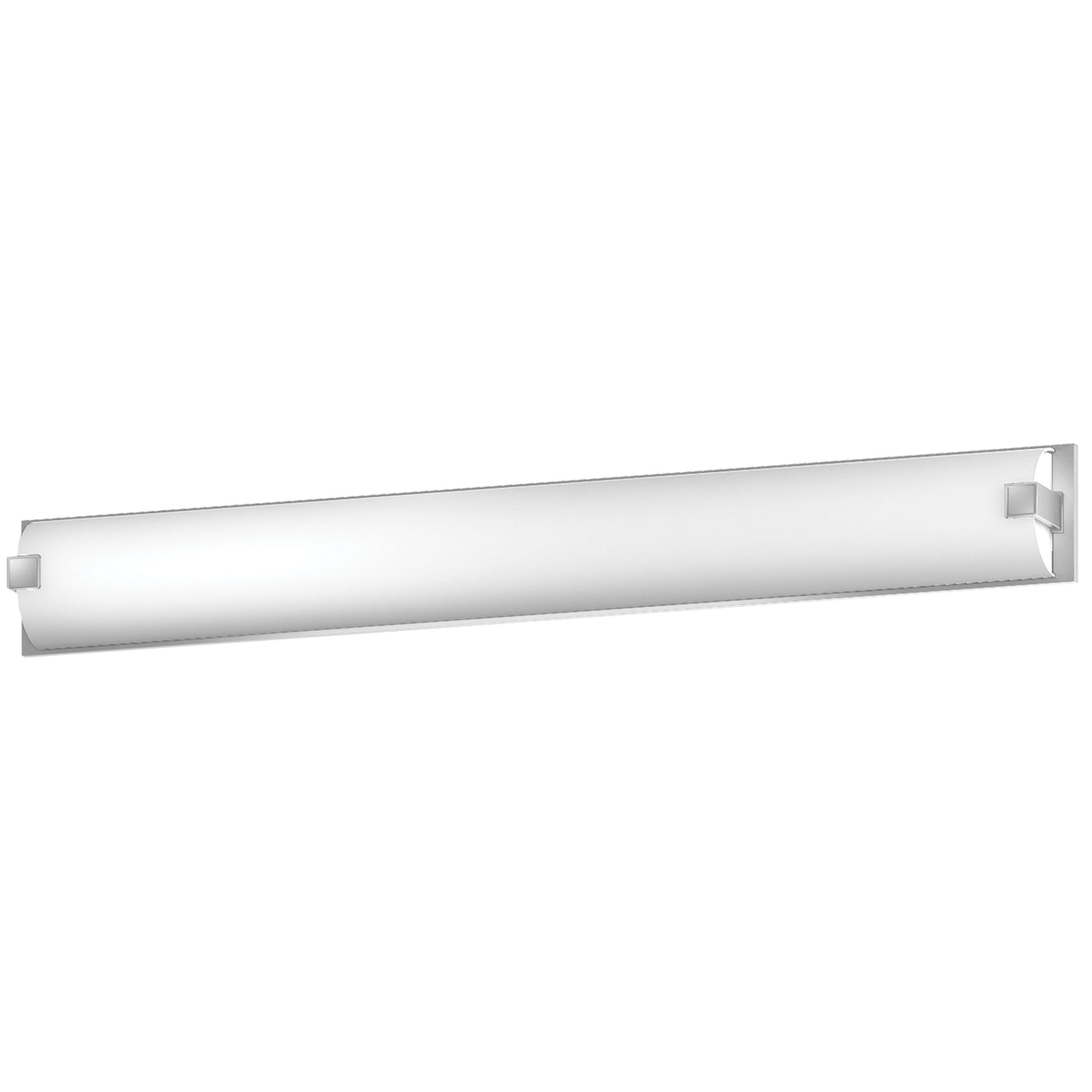 50″W Vanity light bar with satin nickel finish and frosted acrylic shade