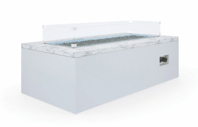 The 60″ Rectangular Aluminum Fire Table offers an extruded aluminum cabinet in a Satin White powder coated finish with an Honed Carrara Marble top. Includes: 10 foot hose to connect to propane (LP) source and clear Glass Beads media for the burner.