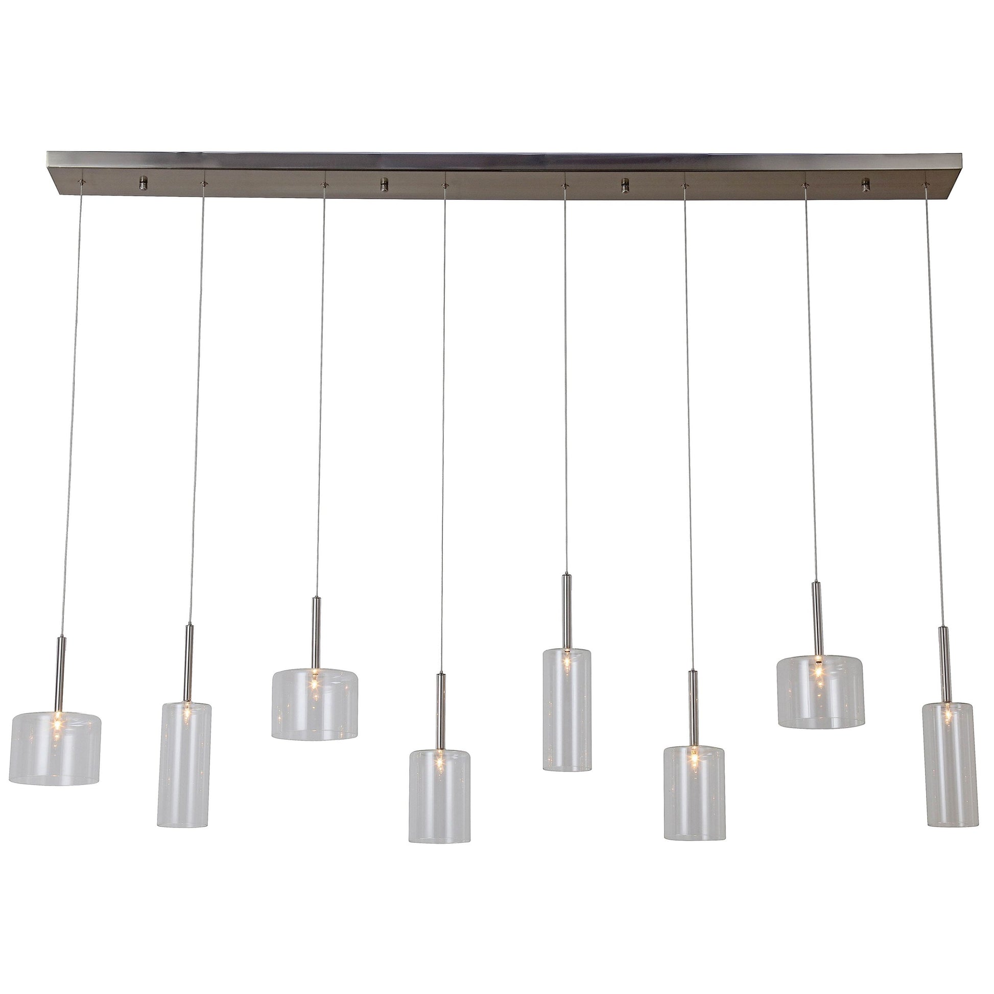 65″W Eight light hanging ceiling light fixture with brushed nickel finish and assorted glass shade sizes,