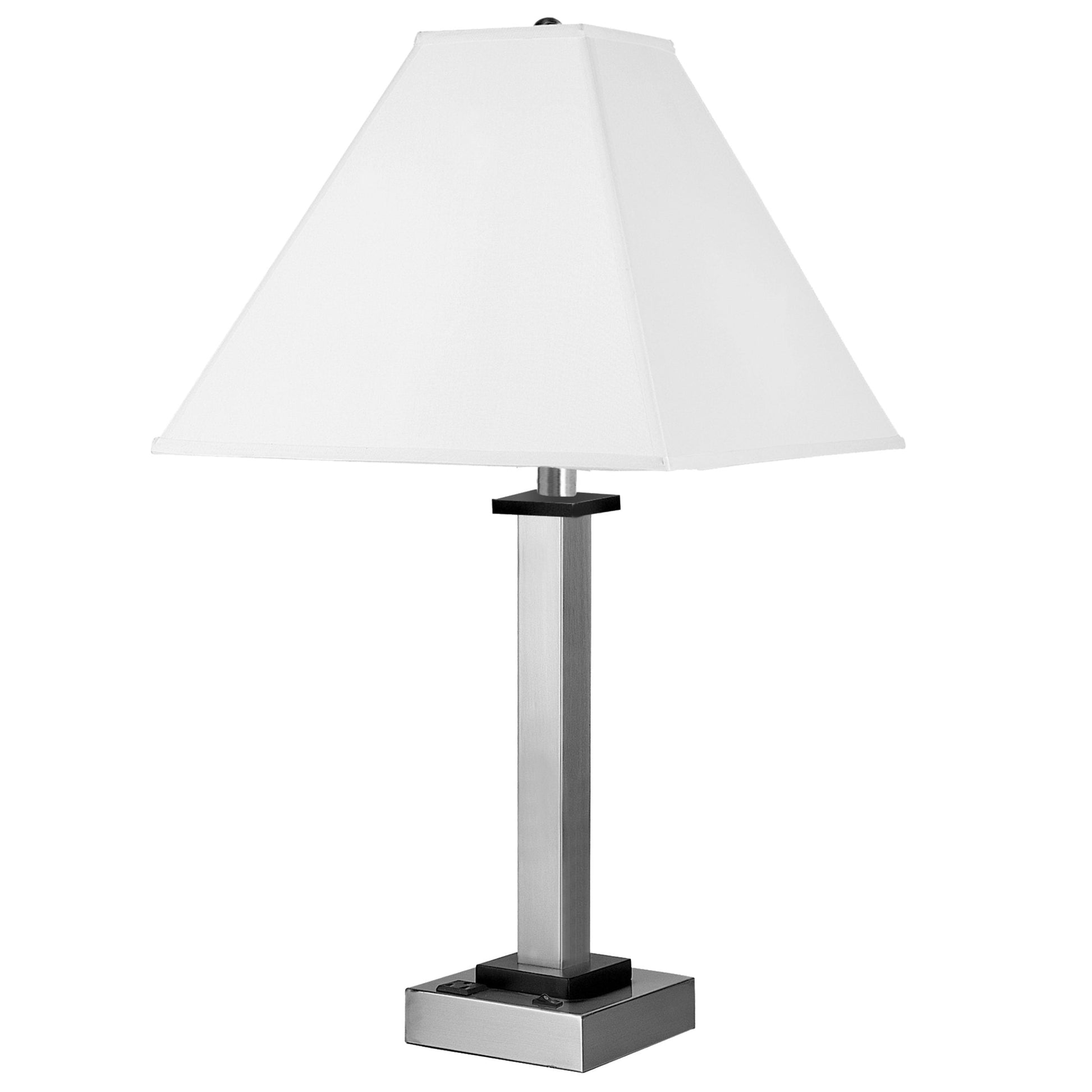 29″H Table lamp with a brushed nickel finish, highlighted with ebony wood accents and one convenience outlet