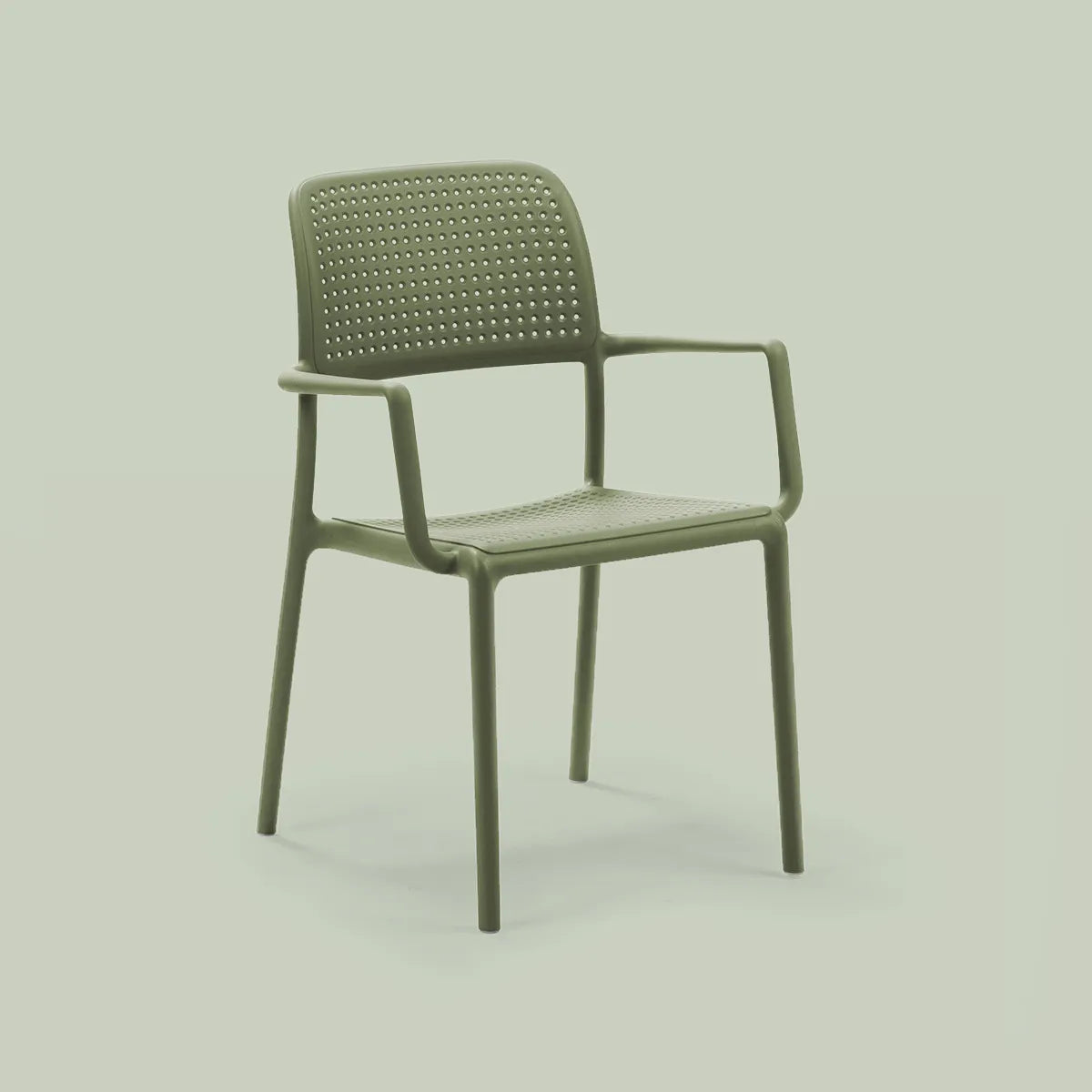 Monobloc chair with armrest. Material: uniformly colored fiberglass polypropylene resins with UV additives. Matt finish. With non-slip feet. Recyclable resin.