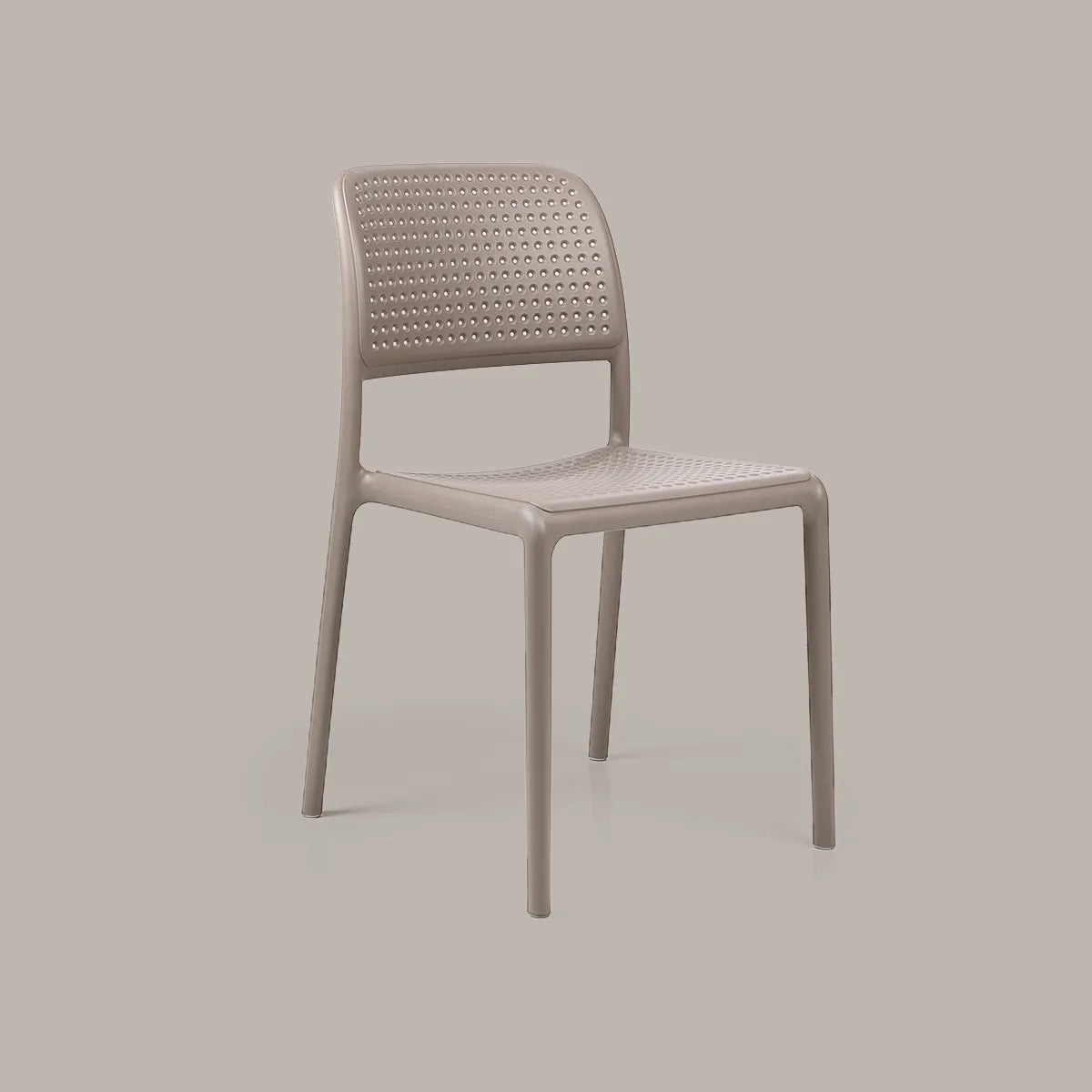 Monobloc chair without armrest. Material: uniformly colored fiberglass polypropylene resins with UV additives. Matt finish. With non-slip feet. Recyclable resin.