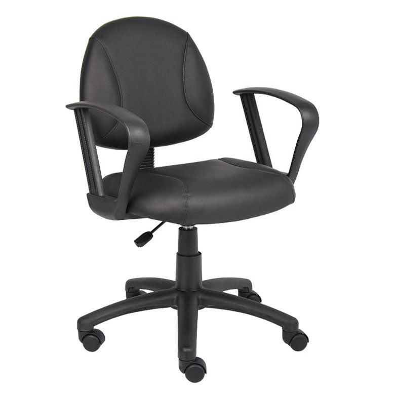 TheDeluxe Posture Chair is upholstered in Black LeatherPlus (leather and polyurethane), for added softness and durability. In addition, it has thick padded seat and back with built in lumbar support for extra comfort. It has an adjustable back depth that can be easily customized for your personal needs. The pneumatic adjustable gas lift allows for easy seat height adjustment, to help you find the personalized sitting style that suits you and your work environment. The five star nylon base allows for smooth movement and stability. The hooded double wheel casters make it easy to move and shift directions. The Loop Arms make for comfortable and natural arm rests.