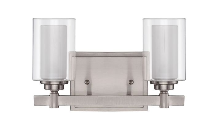 The Celeste 2 Light Vanity in Brushed Polished Nickel with clear outer and frosted inner glass globe makes a statement at home in any decor.