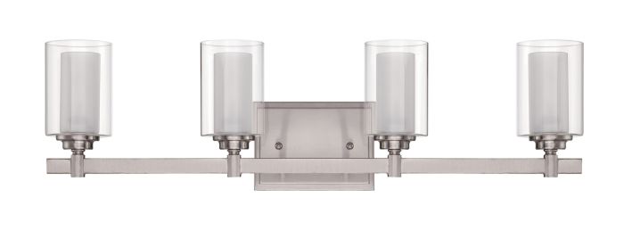 The Celeste 4 Light Vanity in Brushed Polished Nickel with clear outer and frosted inner glass globe makes a statement at home in any decor.