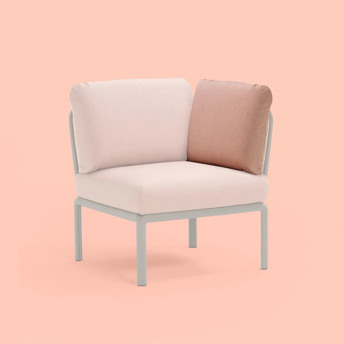 Corner back cushion for Komodo modular system. 22 cm thick. LINING Acrylic Fabric - Solution Dyed Acrylic Fabric - Sunbrella® Acrylic Fabric - Sunbrella® Laminato Acrylic Fabric - TECH PADDING Polyurethane foam (density 18 kg/m3) with a polyester fiber coating (density 450 gr/m2).