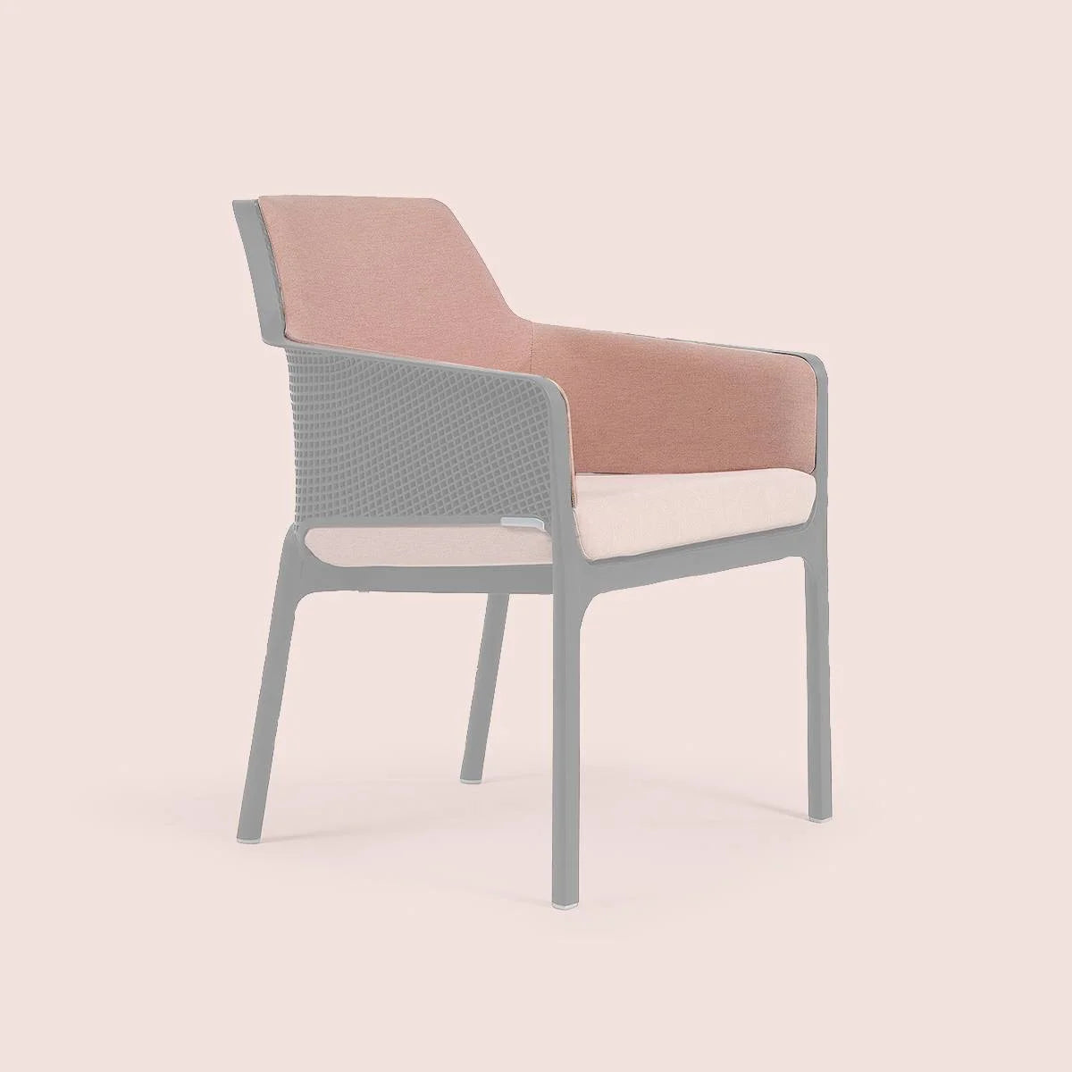 Cushion for Net Relax armchair. With hooks. LINING Acrylic Fabric: 100% yarn dyed acrylic, 5/8 light fastness, washablxe at 30°, dirt repellent and anti-mould treatment. PADDING Polyurethane foam over solid polypropylene frame. Density 70 kg/m3.