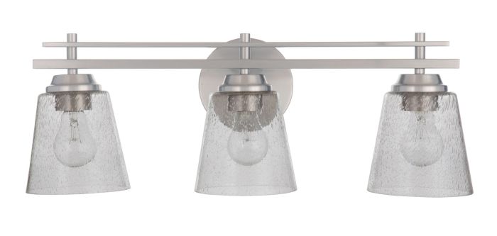 With its distinctive double rail silhouette and clear seeded glass globes for maximum styling, the Drake 3 Light Vanity in Brushed Polished Nickel is equally at home in a transitional or traditional setting.
