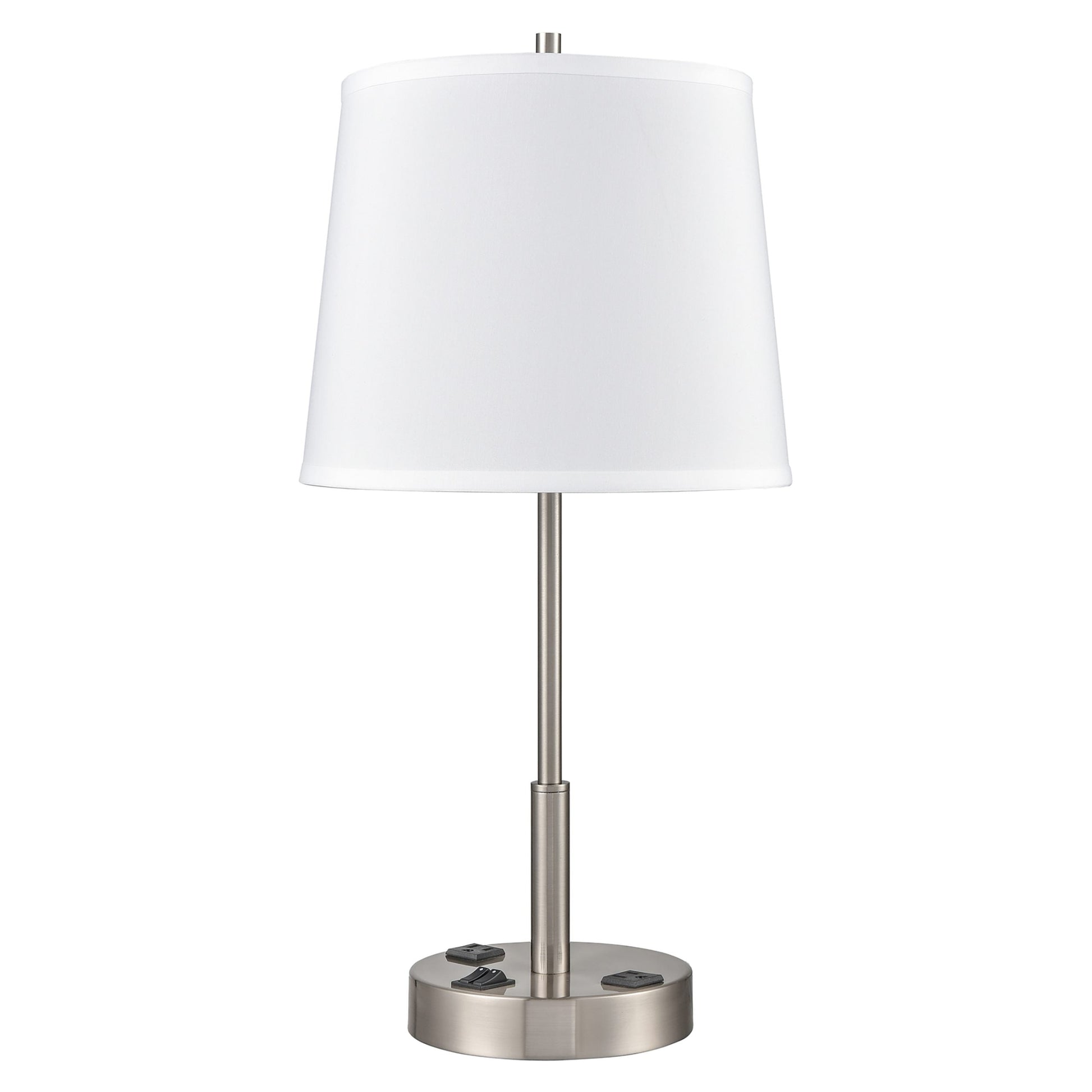 24.5″H Two light table lamp with brushed nickel finish and two convenience outlets