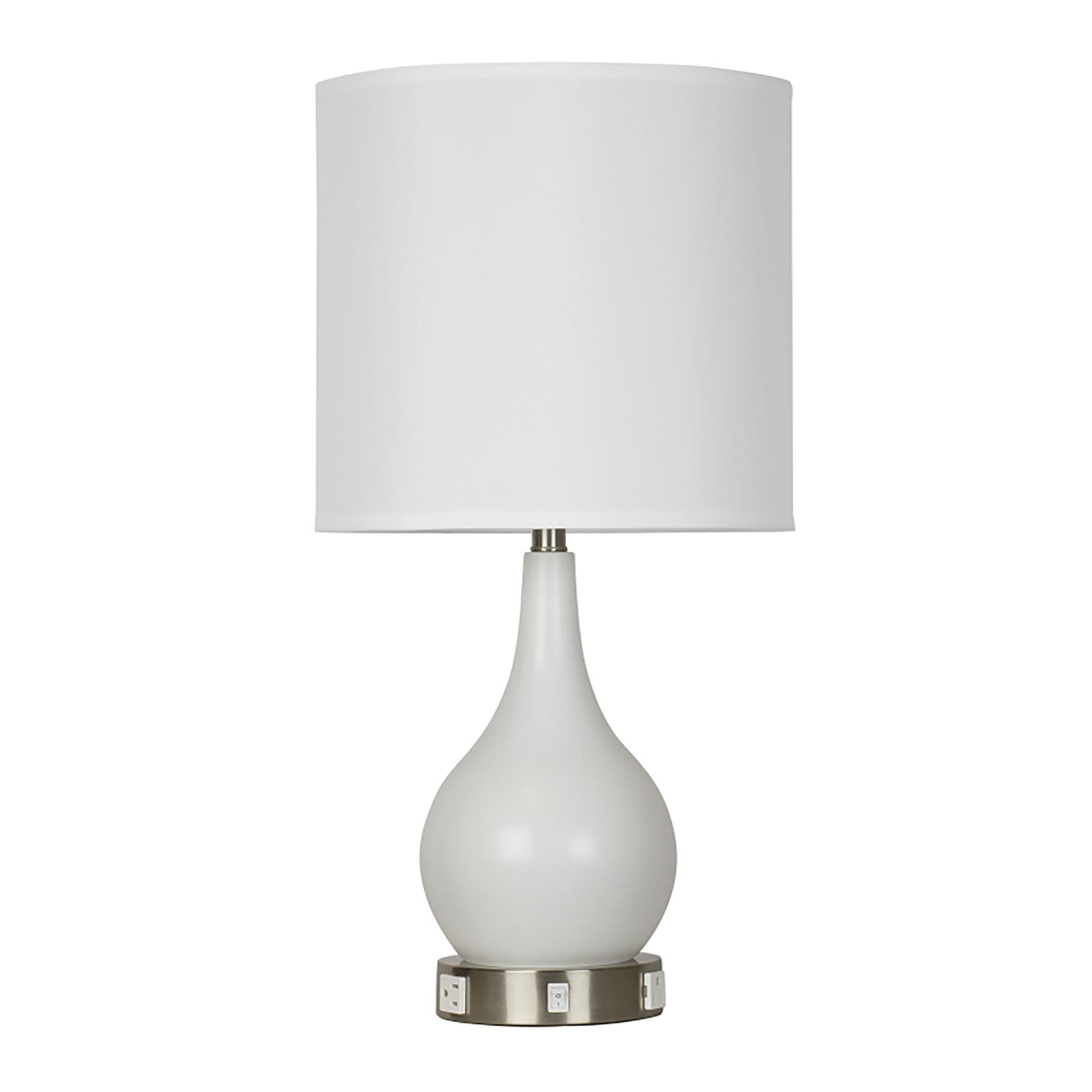 28″H Table lamp with white body, satin nickel base, two convenience outlets and USB charging