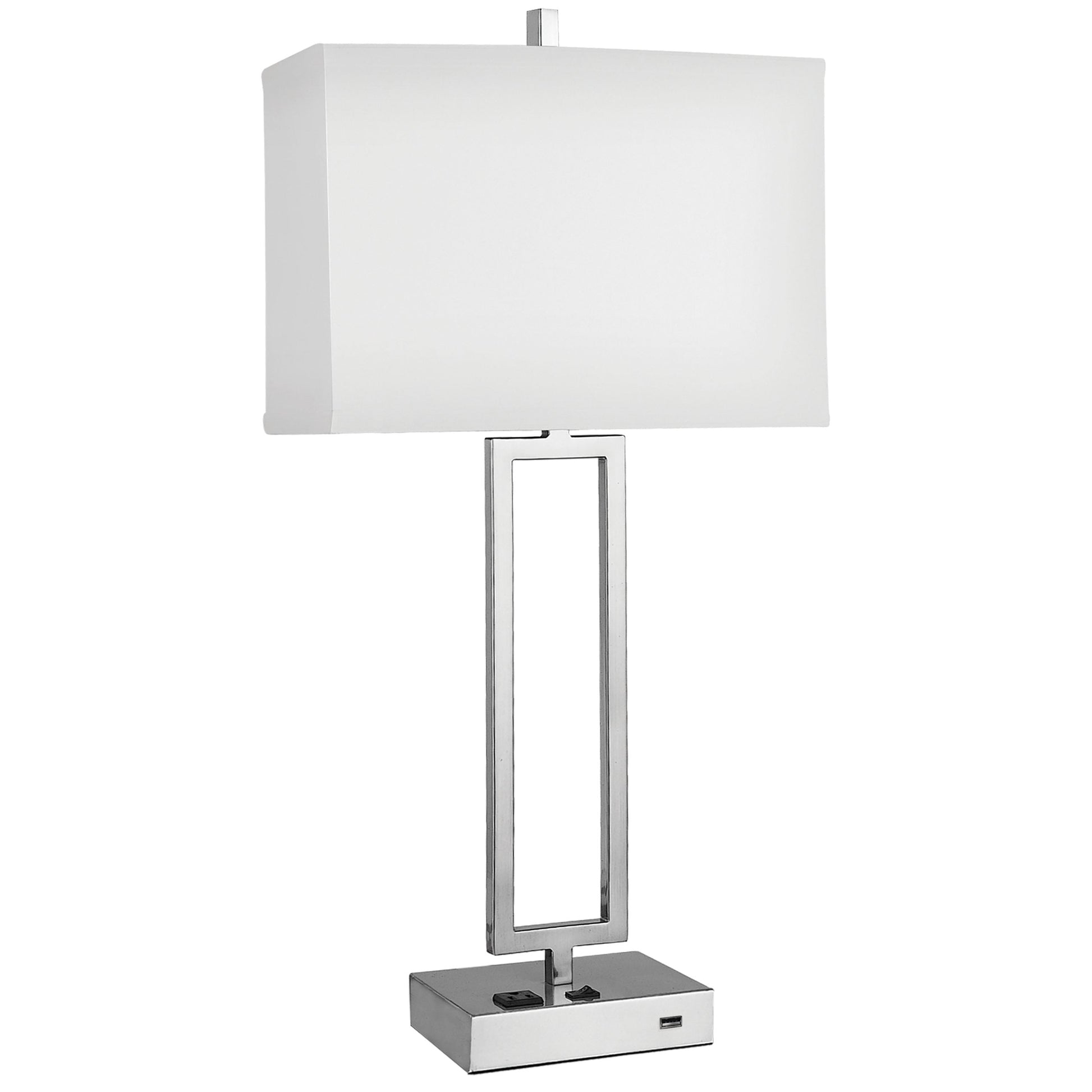 27.5″H Table lamp with with brushed nickel finish, one convenience outlet and USB charging