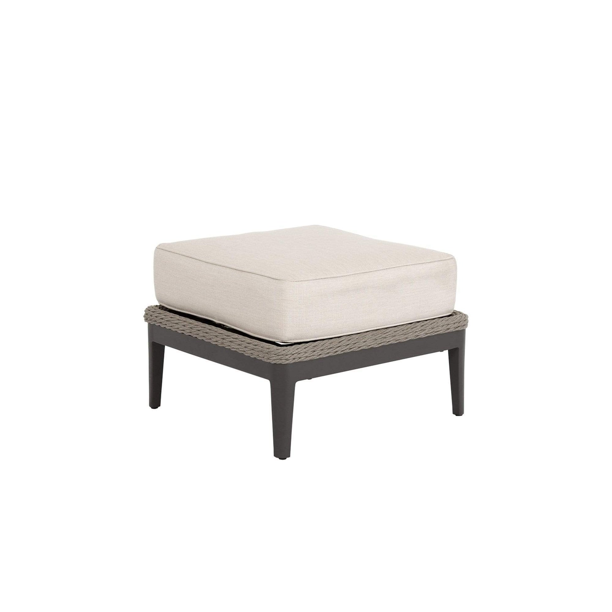 The Malibu Ottoman features a braided rope design plush 6″ box cushion, and tapered leg in powder-coated aluminum.