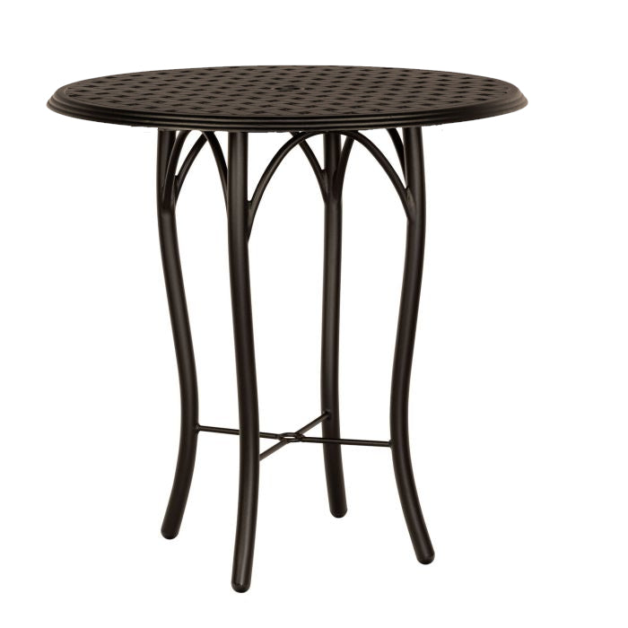 Our 36″ Bar Round table is cast in aluminum and features a lattice-woven top with two different leg-style bases to choose from – this one which is slightly narrowed and conservatively angled, or our second design that opens to a broader base. Its corner-less aesthetic makes it ideal for smaller spaces.