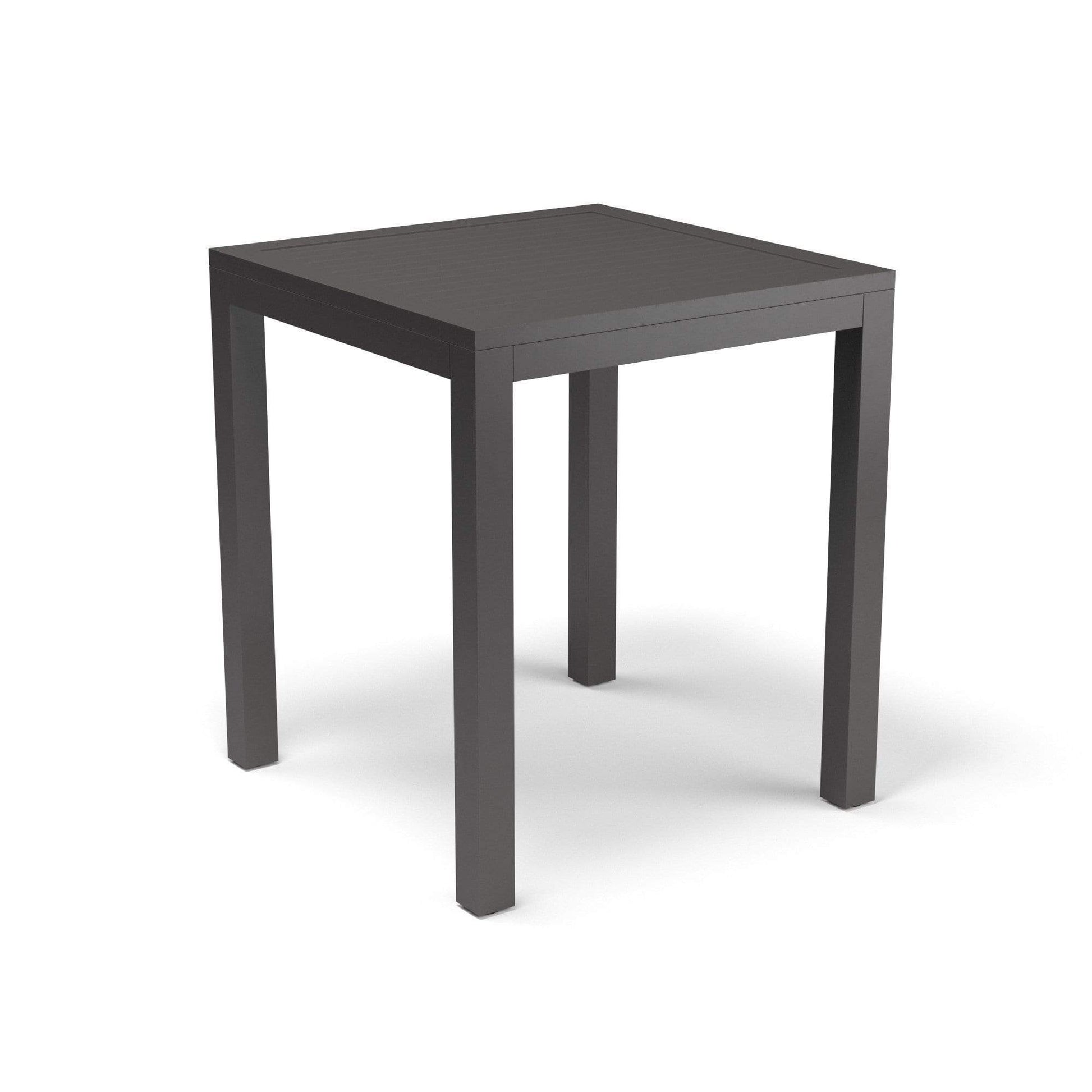 The Vegas Pub Table is crafted in a scratch resistant Graphite finish, on a powder-coated aluminum frame and features a slat table top and umbrella hole.