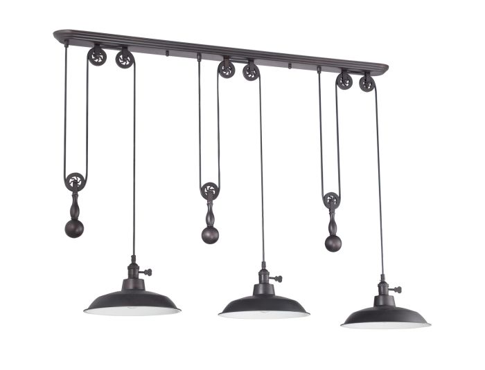 The 3-Light Pulley Pendant by Craftmade features working pulleys for adjustable height pendants with a nod to mid-century industrial design.