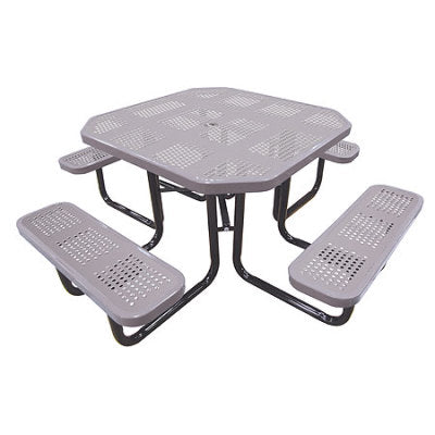 Guests gather around the 46″ Octagon Picnic Table to keep a watchful eye as children play or to dine together in the great outdoors. Our plastic-coated steel picnic tables are safe and durable, making this a for any outdoor space. Available in blue or gray.