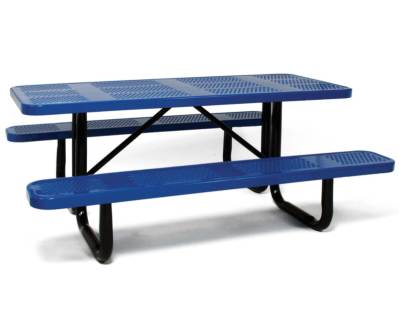 Friends and family take in the great outdoors on the durable and stylish 6ft. rectangle picnic table. Available in red and blue, the plastic-coated steel picnic tables are a welcoming break from hours of play.