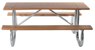 The Recycled Plastic Picnic Table is classically designed and made to last. Durable and earth-friendly, this picnic table’s top and benches are both made of recycled plastic. Base is made of galvanized steel. Durable and weather resistant, this picnic table is suitable for any outdoor activity area.