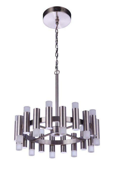 The Simple Lux Lighting Collection by Craftmade features brilliant dimmable LED light illuminating the frosted acrylic shades of this contemporary collection of 16", 20" and 27" diameter chandeliers and 12" diameter semi flushmount fixture. Sleek cylinders with frost LED caps alternating up and down surround the round frame suspended from a round canopy by a combination of rod and adjustable height chain. Damp Rated