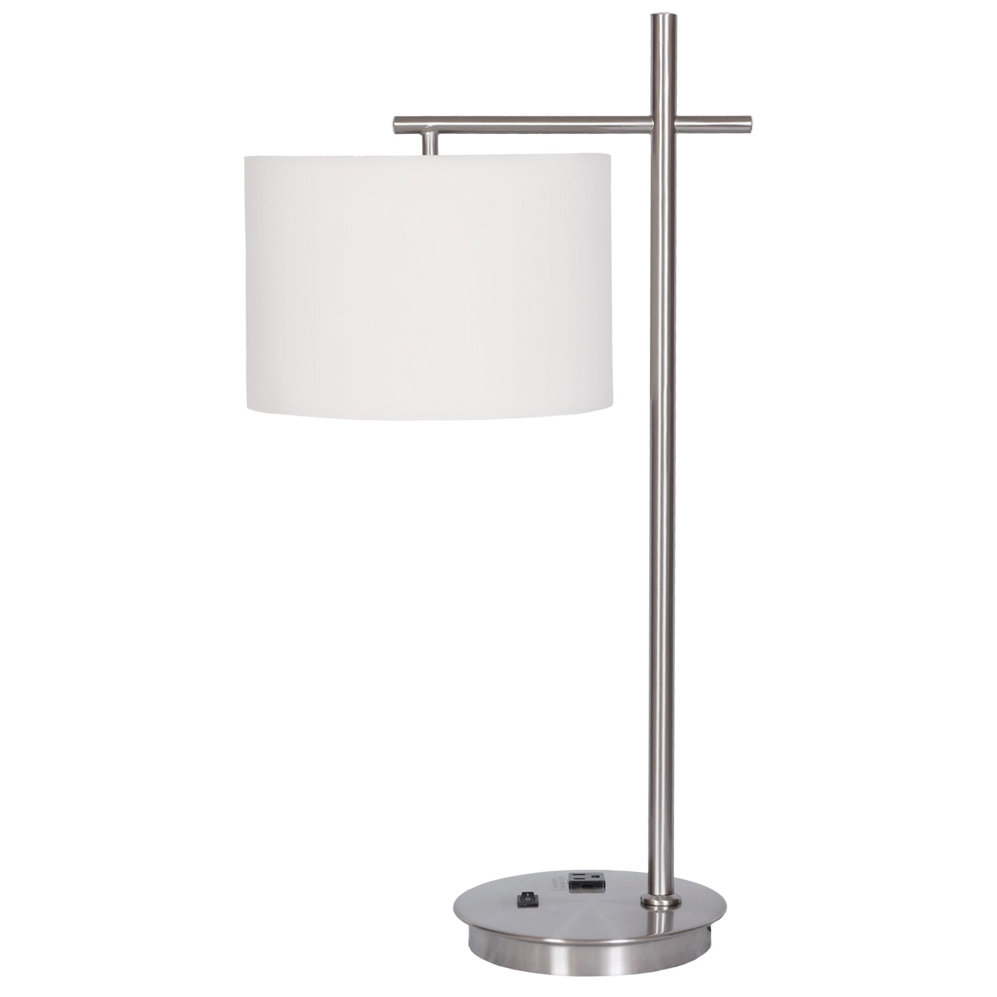 26.5″H Table lamp with brushed nickel finish and one convenience outlet