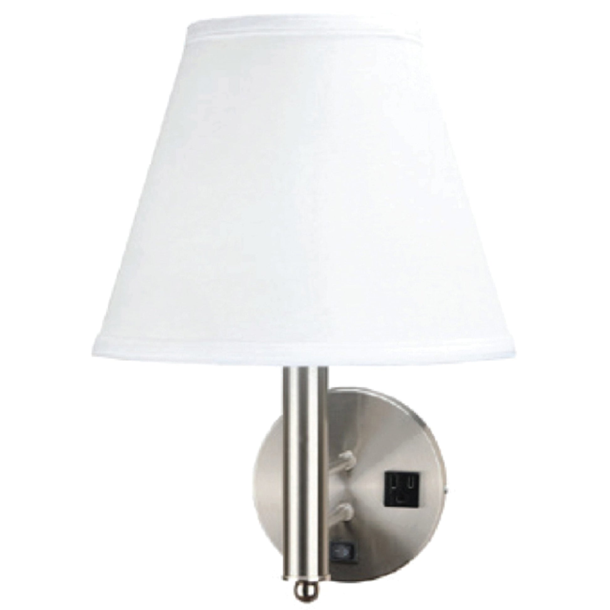 17″H Wall sconce with brushed nickel finish and one convenience outlet
