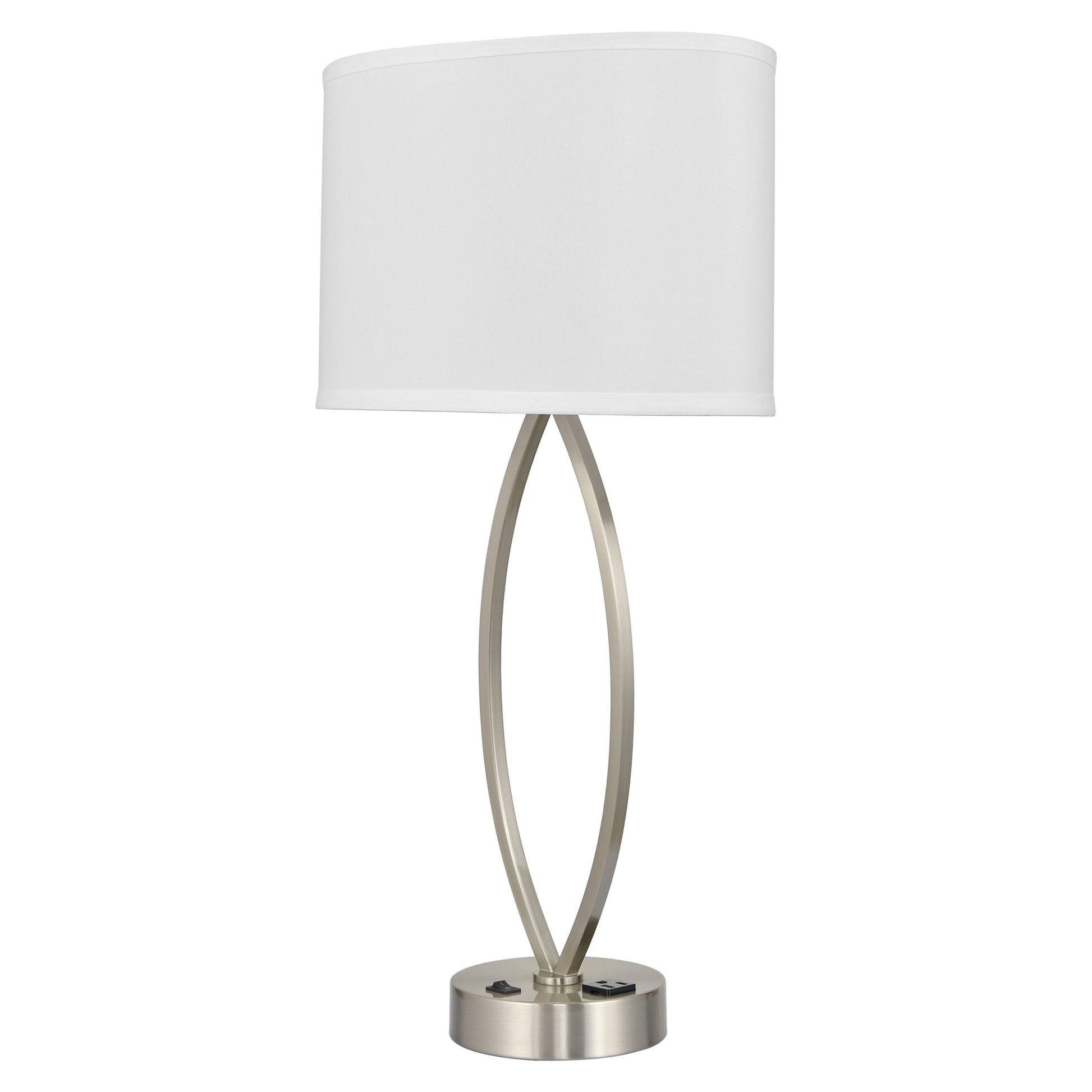 26″H Table lamp with brushed nickel finish and one convenience outlet