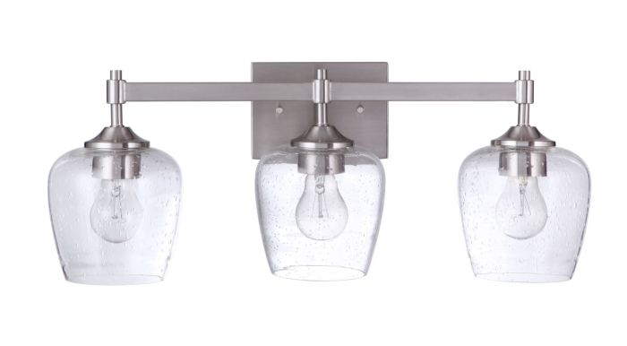 Created to complement your lifestyle, the updated classic vanity collection, Stellen, is the perfect combination of large clear seeded glass curved shades and minimal back plate available in four sizes from a single light to four light vanity.