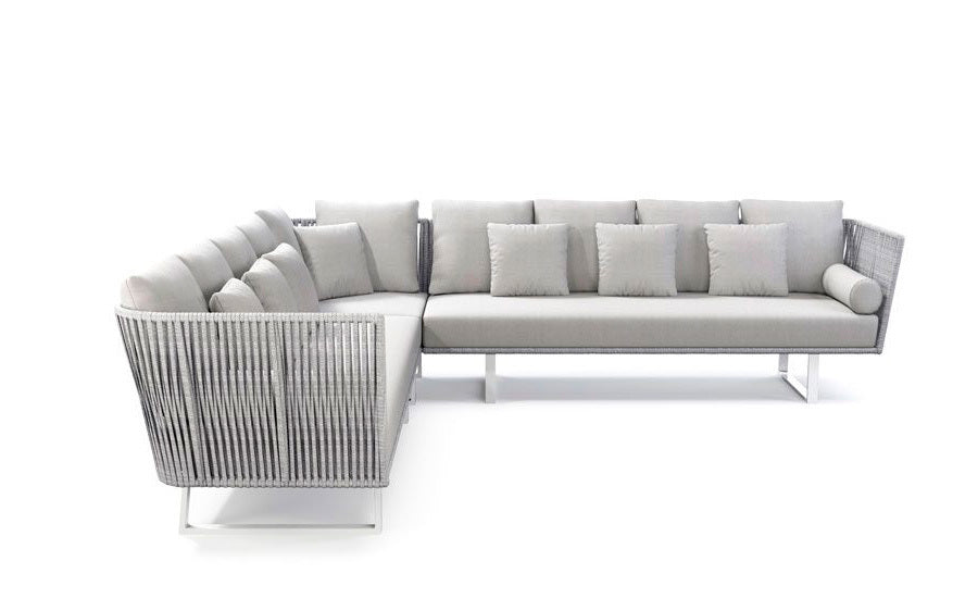 The Stone Gate Sectional End Module Left Arm Facing from the Stone Gate Collection. The Stone Gate collection brings something organic to the outdoor furniture space with its wound rope designs. Intertwining playful patterns with a durable aluminum frame, this distinct collection brings a stunning sophistication to any outdoor space. Whichever piece you choose is sure to be both a cozy comfort and a conversation starter.