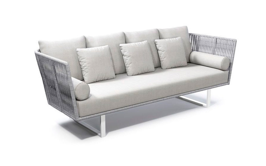 The Stone Gate Three Seat Sofa from the Stone Gate Collection. The Stone Gate collection brings something organic to the outdoor furniture space with its wound rope designs. Intertwining playful patterns with a durable aluminum frame, this distinct collection brings a stunning sophistication to any outdoor space. Whichever piece you choose is sure to be both a cozy comfort and a conversation starter.