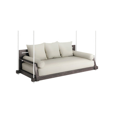 The Swing Daybed, with a woodgrain-style frame, is available in Chestnut and Smoke. Suspend it with the included thick, white ropes and snuggle up with the plush back and bolster pillows. The twin mattress-sized seat cushion makes it possible to either stretch out or pile in with family and friends while enjoying a sweet summer afternoon. Rust-proof aluminum frames are powder coated for smooth, beautiful finish that will last for years to come. Areas with high salinity should rinse aluminum frames regularly.