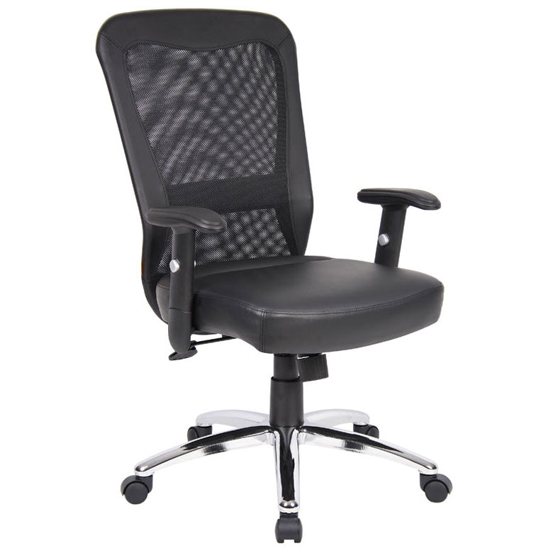 The Web Chair is the perfect blend of a comfortable and professional design. The chair itself is created with a mesh backing for ultra-breathability, while the seat is designed with a solid, classy .black LeatherPlus material/ The chair boasts a sturdy 27 inch chrome base with 2 inch dual wheel castors for a smooth roll and has a weight limit of 275 lbs. The chair has adjustable arms and with a pneumatic gas lift, it has an easily adjustable height as well. The chair also features tilt tension and an upright lock.