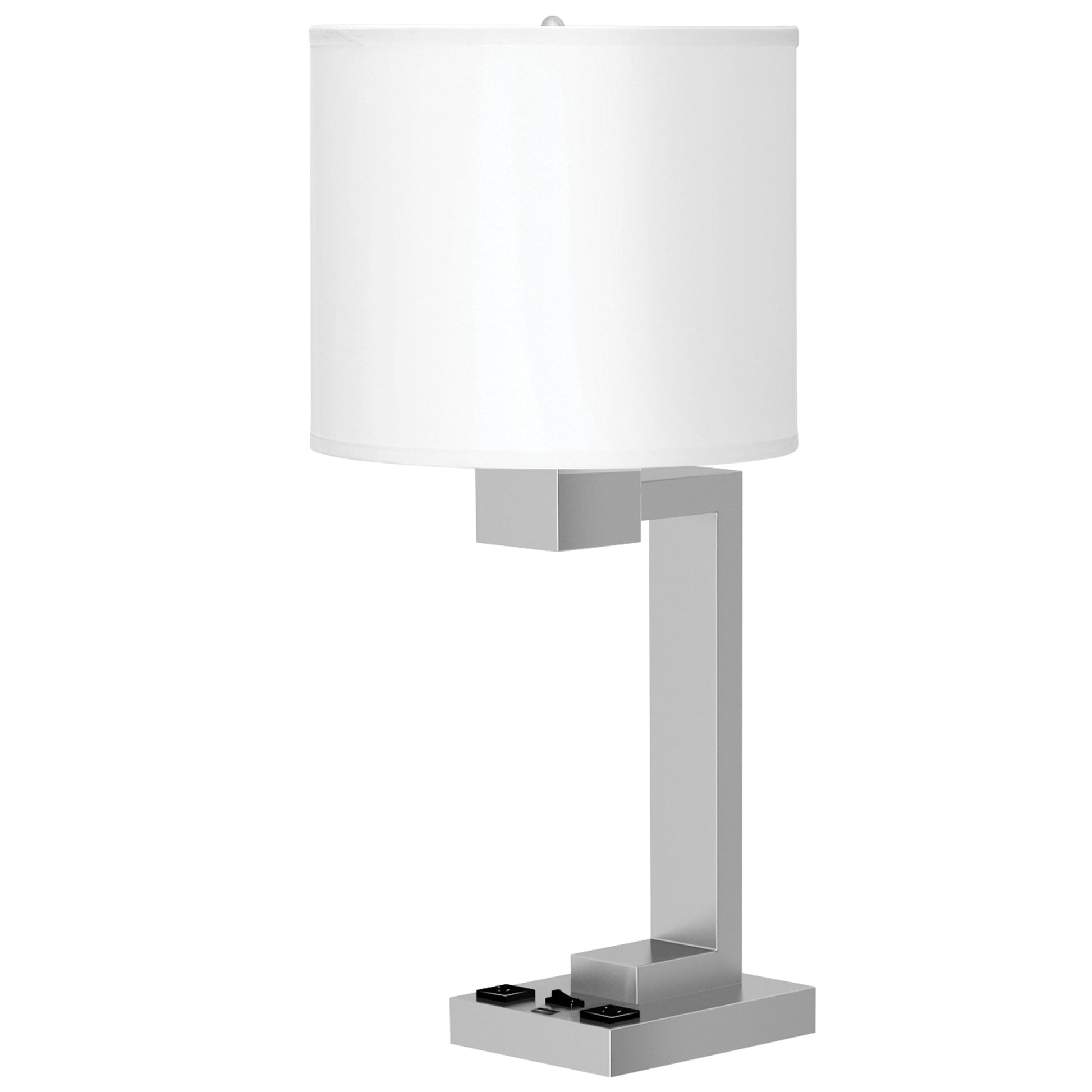26″H Table lamp with with brushed nickel finish, two convenience outlets and USB charging