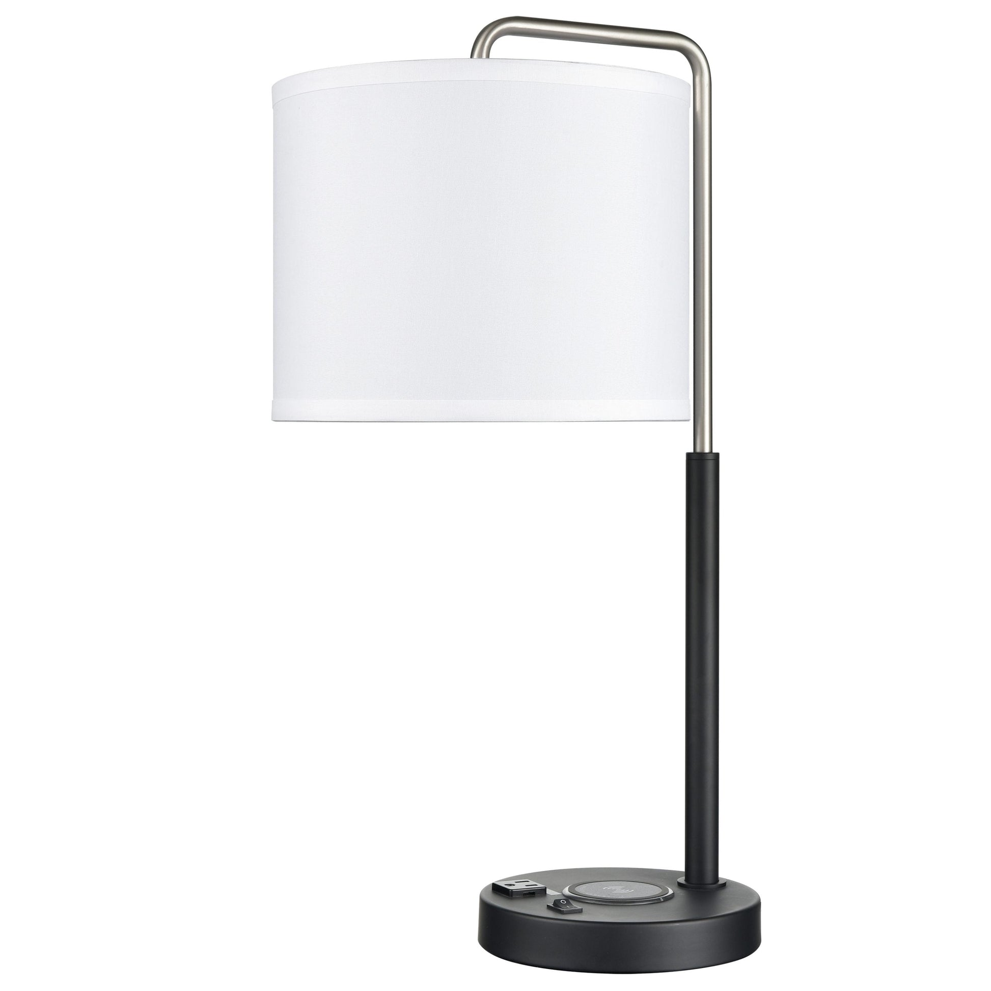 23”H Table lamp with brushed nickel and black finish, one convenience outlet, USB charging and Qi wireless phone charging