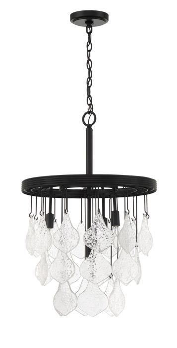 The Vesi 4 Light Pendant features rings of clear textured glass crystals surrounding a cluster of 4 Candelabra Based bulbs to create a beautiful waterfall inspired pendant ideal for any space.